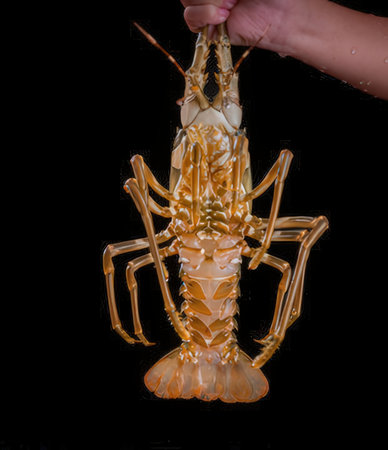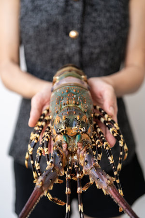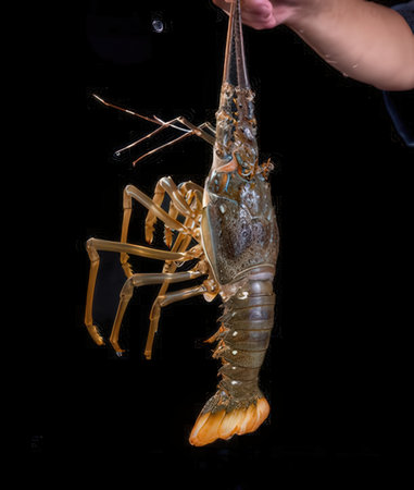 Spiny lobster in the hands, inhabits tropical and subtropical waters.