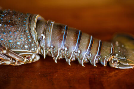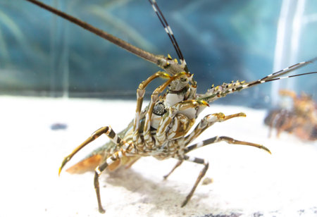 Caribbean spiny lobster climbed up shows the lower part of the body.Panulirus argus. spiny lobster in the aquarium