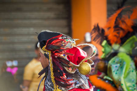 native man defile in colorful costume at dominican traditional carnival annual event