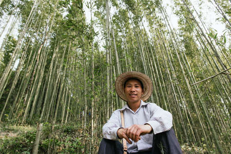 Sapa, Vietnam - April 14, 2016: Vietnamese bamboo woods. High trees in the forest. Person watching after plantation