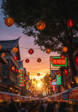 A vibrant street scene at sunset with colorful lanterns and a crowd of people in an Asian city
