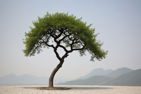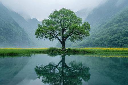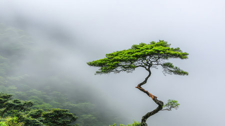 A stunning solitary tree elegantly rises amidst a foggy landscape, showcasing nature's beauty and tranquility in a serene green environment.