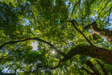 An upward perspective captures a large tree with dense, green leaves reaching towards the sky. The image showcases a textured tree trunk and branches that fill the frame. This natural composition, with overhead lighting, provides a visually appealing look suitable for various commercial or editorial applications.