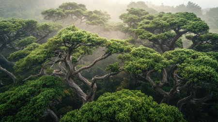 A dense canopy of green trees stretches across a misty forest, creating an uplifting atmosphere. The sunlight filters through the foliage, enhancing the serene scenery.