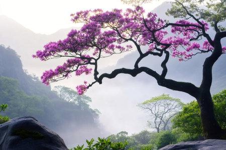 Majestic rhododendron tree in full bloom overlooking a misty valley bathed in the golden light of sunrise
