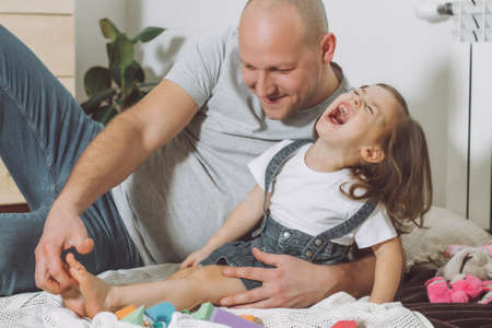 Father plays with little daughter 2-4 on floor. Dad tickles kids feet. Family, having fun