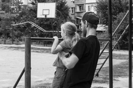 Girl hanging on horizontal bar. Child with father doing motion exercises on playground outdoor. Healthy family leisure sport activity. Kids physical training on sports stadium. Black and white photo.