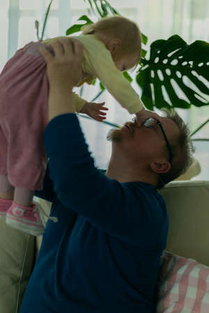 Father playfully holding his baby son, making silly faces to evoke laughter and create joyful moments of bonding and connection