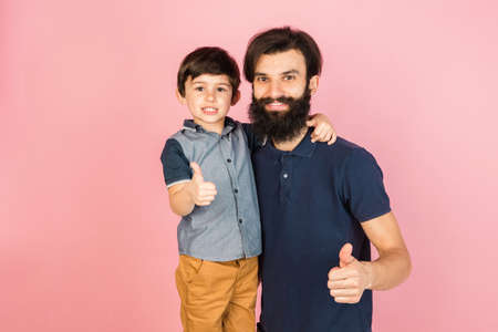Hes cool. Happy man point finger at boy showing thumbs ups. Cool family. Childhood and parenthood. Parent child relationship
