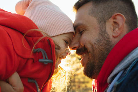 Hugs. Happy father and little cute daughter walking down the forest path in autumn sunny day. Family time, togehterness, parenting and happy childhood concept. Weekend together with sincere emotions.