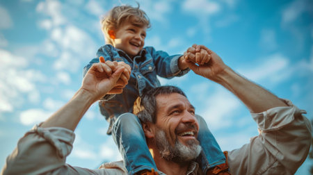 Father's Day. happy father with his son on his shoulders against blue sky, from side view. boy is holding man's hands and smiling happily at him.