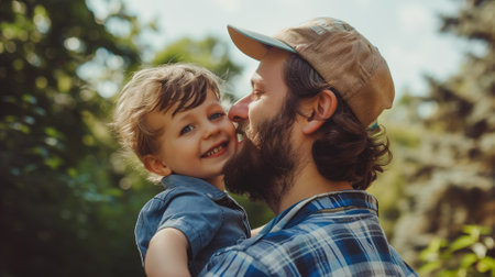 Loving father gently holds his little toddler, showing a heartfelt parentchild bond amidst nature