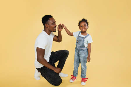 Smiling african american dad and his daughter girl in casual clothes posing isolated on yellow background studio portrait. People emotions lifestyle concept. Mock up copy space. Giving fists bump.