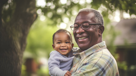 A smiling man cradles a happy toddler; both warmly lit, earthy tones create a joyful portrait