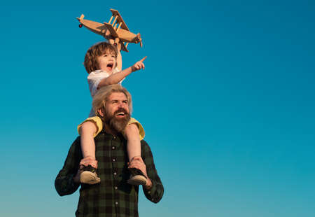 Boy with toy airplane sitting on fathers shoulders. Father and son have fun and playing with toy airplane. Family relationship with son. Love daddy.
