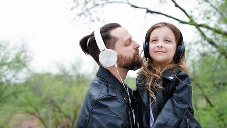 Fashionable stylish family for a walk. Charming schoolchild and her handsome young dad in headphones are listening to music. Time together. Family look. Urban casual outfit. Relaxing outdoors