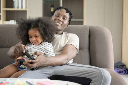 happy mixed race dad and beautiful child in the merry x-mas morning in bedroom