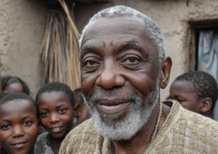 Smiling elderly man with gray beard stands among happy children, capturing a moment of joy and togetherness in a vibrant rural environment filled with warmth