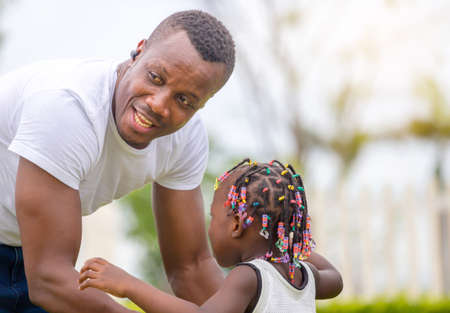 Fathers Day.Smiling African American father and young daughter sharing a happy moment together.