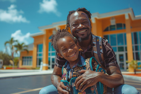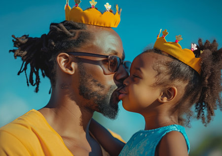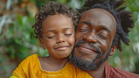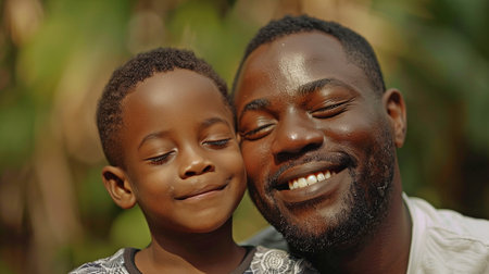 A close-up of a happy young African man and a child enjoying a sunny day. This image evokes feelings of joy, love, and family bonding. Ideal for fatherhood or lifestyle concepts.