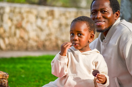 Father and son enjoying a picnic and eating cookies at the park