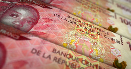 Guinean francs money printing 3d illustration. 10000 GNF banknote print. Concept of finance, cash, economy crisis, business success, recession, bank, tax and debt in Guinea.