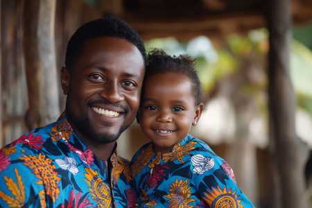 Father and daughter, both wearing traditional African clothing, are spending time together outdoors and enjoying each other's company