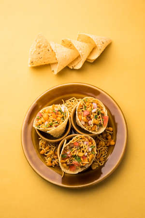 masala papad, roasted urad daal papad with onion, tomato, sev and coriander toppings