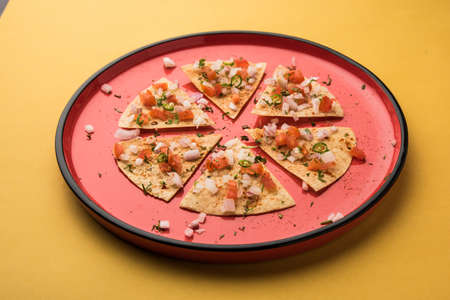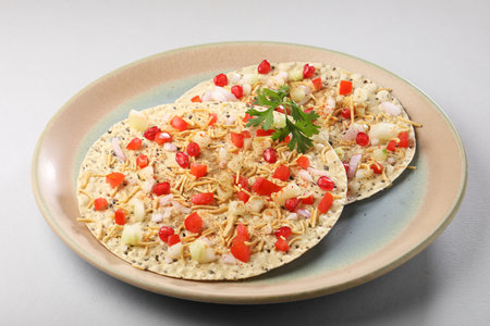 Masala Papad or papadum is a delicious Indian snack made using roasted or fried papad topped with a tangy and spicy onion tomato mix