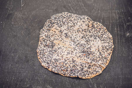Homemade matzo with microgreen peas. Unleavened flatbread bread. Pesah celebration concept. Jewish Passover background. Pita.