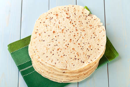 Mexican snack tortilla on neutral background with copy space