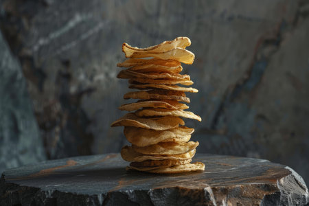 A tower of crispy potato chips resembling a natural landscape of stacked petals. An artistic arrangement of ingredients on a wooden table