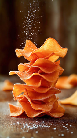 Discover the enticing beauty of stacked sweet potato chips lightly sprinkled with salt. Perfect as a snack or appetizer theyre a crunchy delight