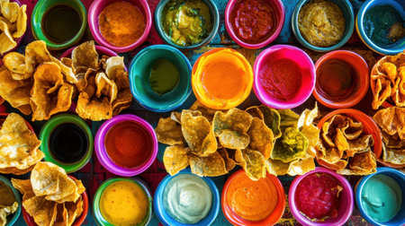 A captivating display of colorful sauces paired with crispy snacks, perfect for a festive gathering. This vibrant image showcases Mexican cuisine's joy and variety.