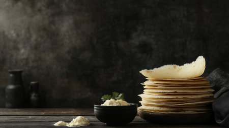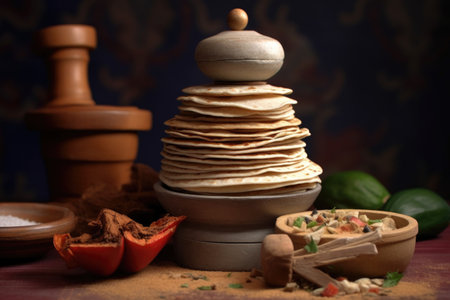 tortilla stack with a traditional mortar and pestle, created with generative ai