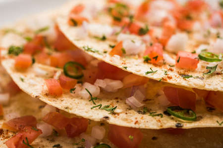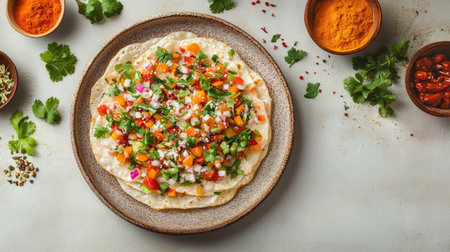 This image showcases freshly made tortillas generously topped with vibrant salsa and fresh vegetables, beautifully arranged on a rustic plate with spices. Perfect for food lovers!