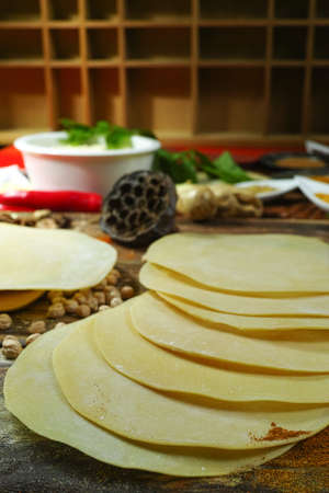 Colorful Indian food - papadum, chickpea, gram flour and spices on textured wooden table top