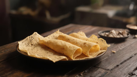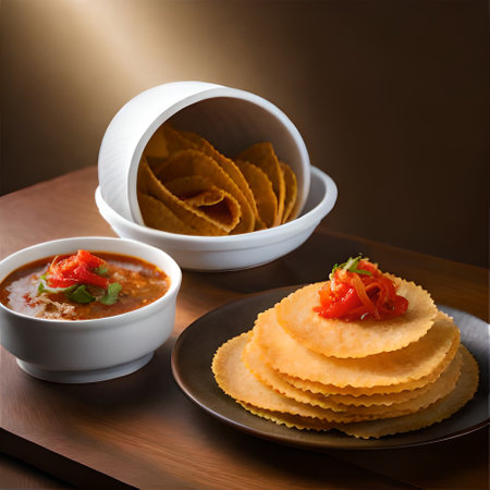 Indulge in the crispy delight of Indian papad served with vibrant chutneys, perfect for elevating any culinary experience or food presentation.