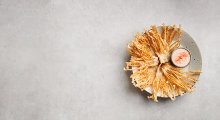 Crispy Fried Enoki Mushrooms with sauce, copy space, top view