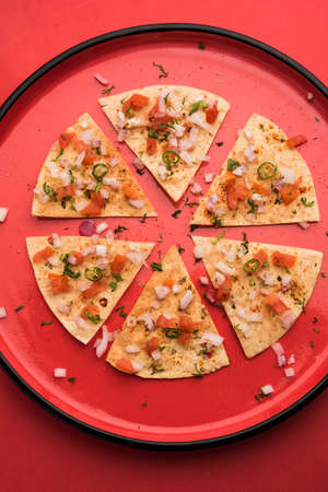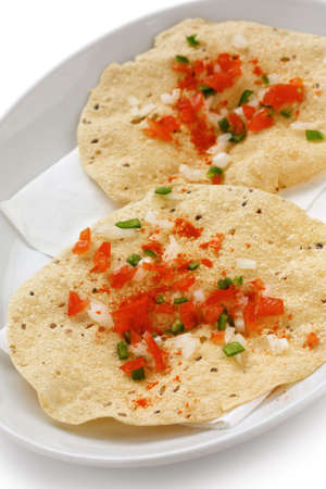 Masala Papad or papadum is a delicious Indian snack made using roasted or fried papad topped with a tangy and spicy onion tomato mix