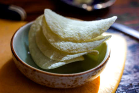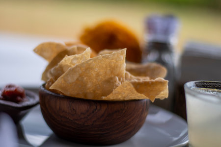 Tortilla chips served in a wooden bowl with welcome drink in a restaurant in BALI, Indonesia