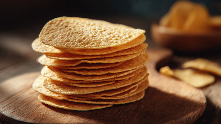 Golden tortilla layers are artistically arranged, showing their soft texture and slight sheen. The warm light enhances the inviting appearance in a cozy kitchen.