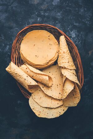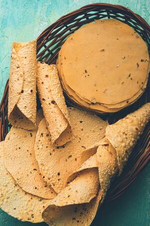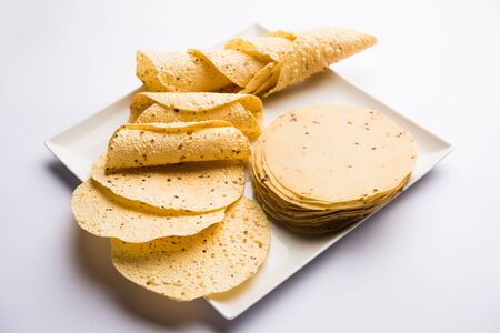 Gujarati papad or papadum in raw dried form with roasted cone, roll and flat variation