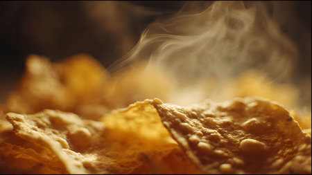 Close-up of steaming, freshly made tortilla chips, perfect for appetizers or snacks. Warm, crispy, and delicious.