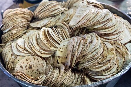 Big bowl of chapati - traditional Indian bread at the Golden Temple (sri harmandir sahib) in the Langar (Kitchen)