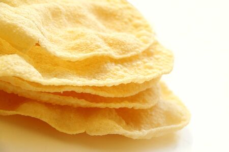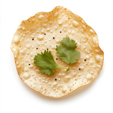 A close-up of a papadum, with a thin and crispy lentil wafer, served as an appetizer, isolated on clean white background.
