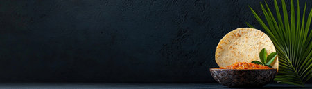 A vibrant composition featuring a fresh tortilla alongside a spicy sauce in a rustic bowl, accented by tropical leaves on a dark background, perfect for culinary themes.