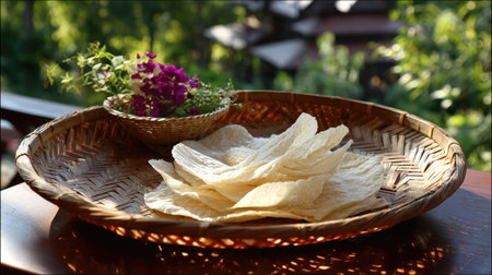 This image showcases traditional crispy snacks beautifully arranged in a bamboo basket, complemented by fresh flowers, capturing a serene outdoor setting.