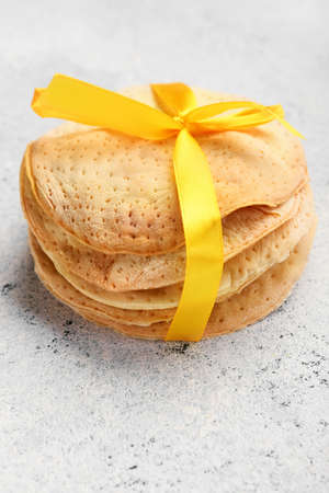 Close up vegetarian organic yellow corn rice-cakes food Asian style in restaurant. Vegetable Chip cornflakes meal.