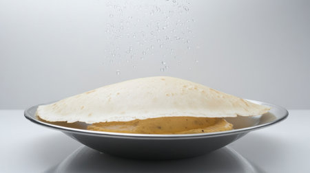 A close-up image showcasing a soft tortilla being steamed in a shiny silver bowl, with water droplets creating an inviting and appetizing presentation. Ideal for culinary use.